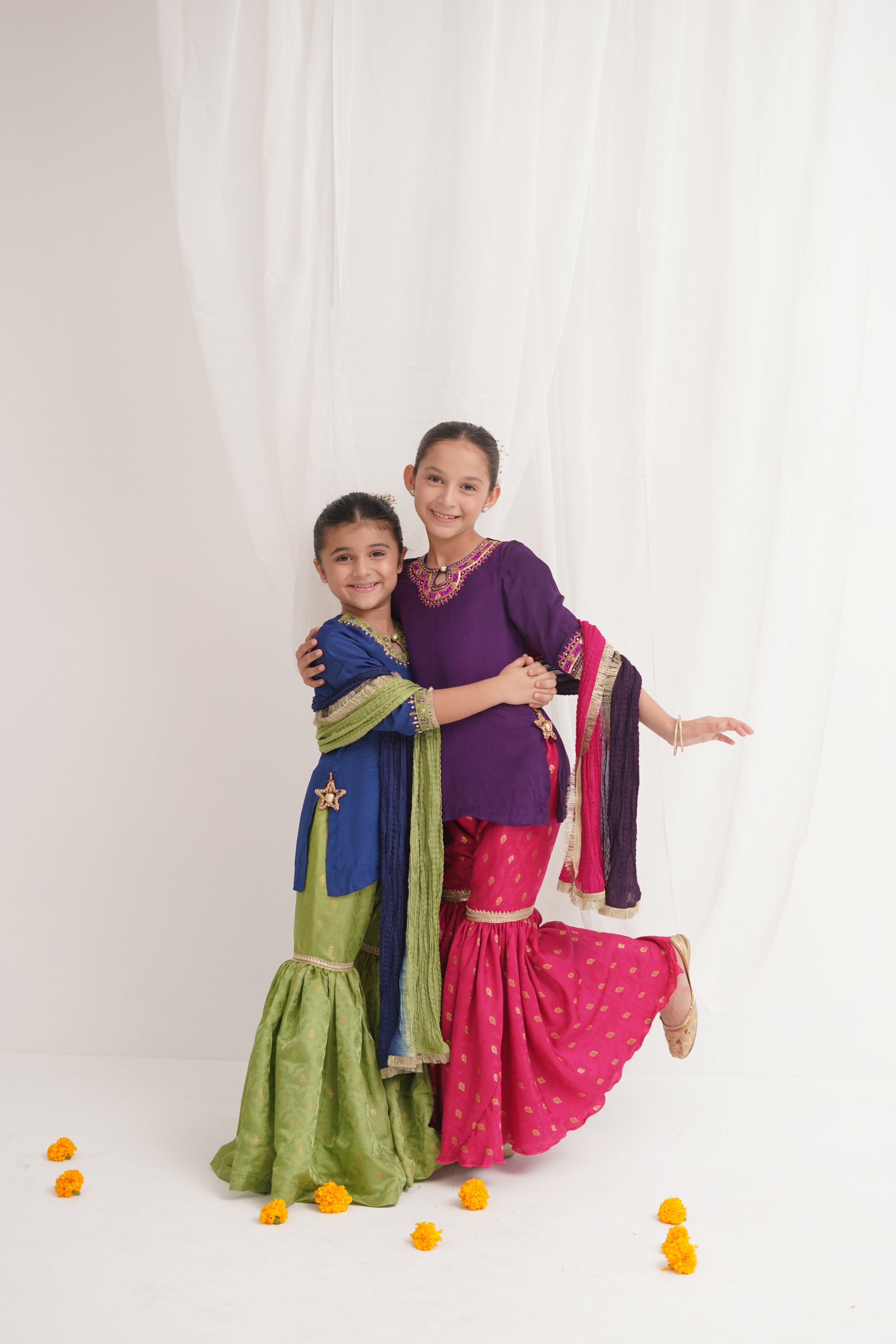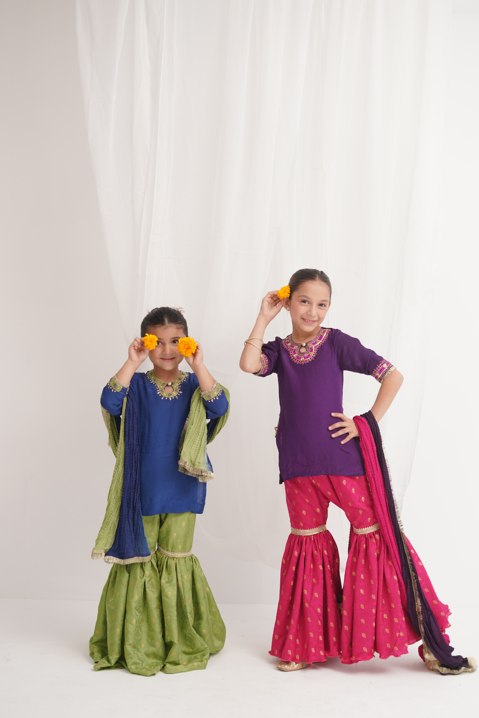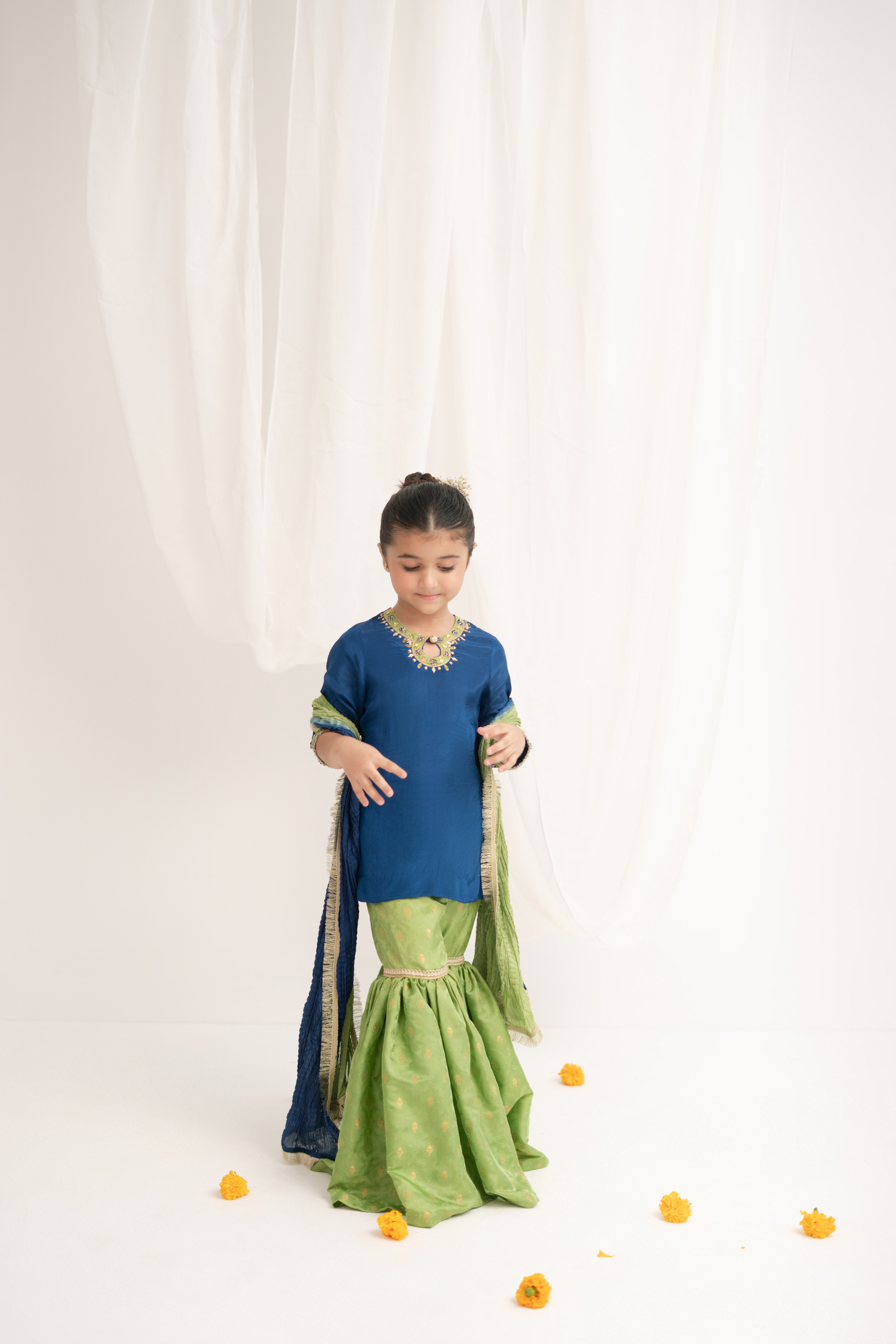 Introducing "Abiha" a royal blue coloured silk hyderebadi gala short shirt with beautiful appliqué and hand embroidery on the neckline and sleeves. Paired with a contrasting lime green banarsi silk gharara, "Abiha" is your go-to for all traditional events this season! The matching potli is sure to keep all your little diva's essentials. Not to forget the kiran on the sleeves and dupatta add that extra touch of festivity for all eyes to be on your princess.