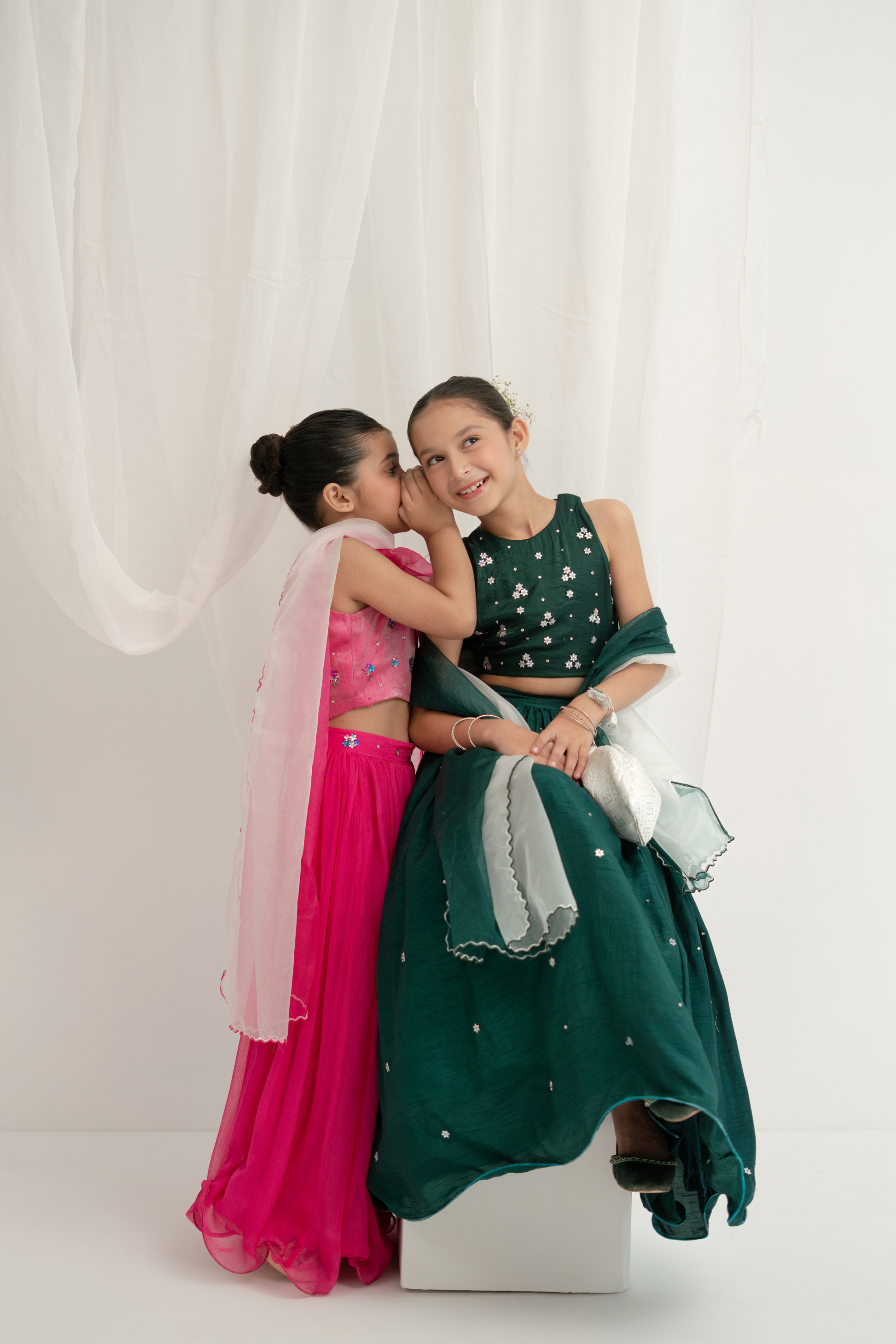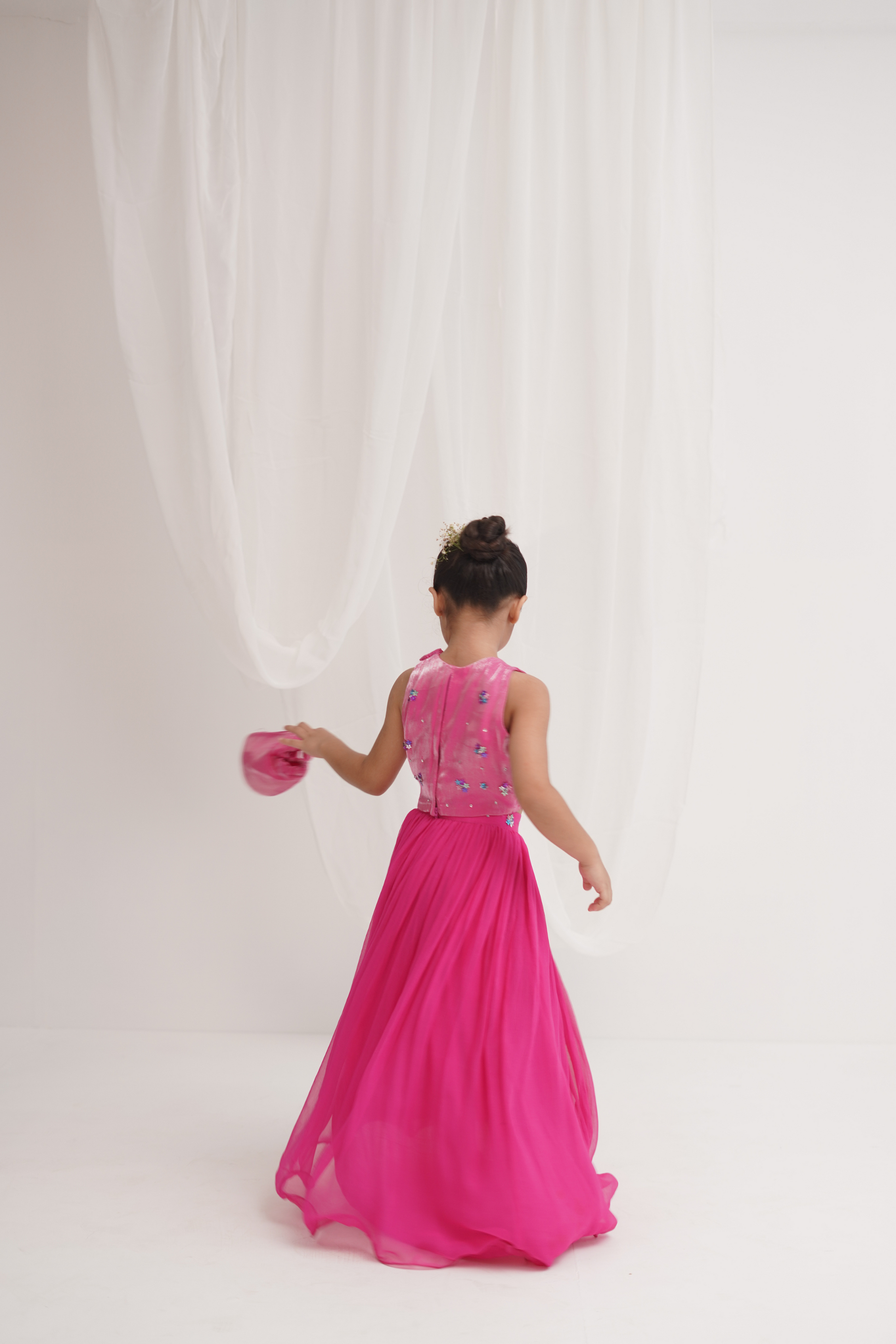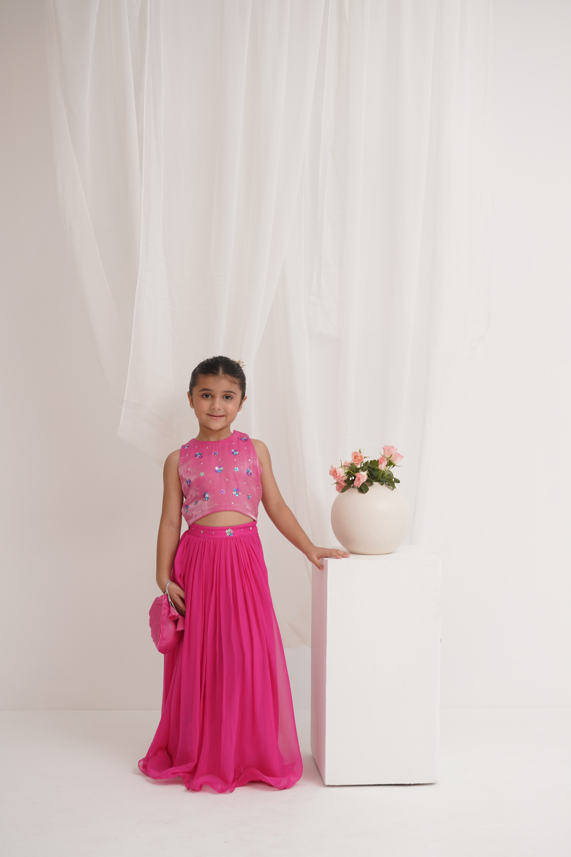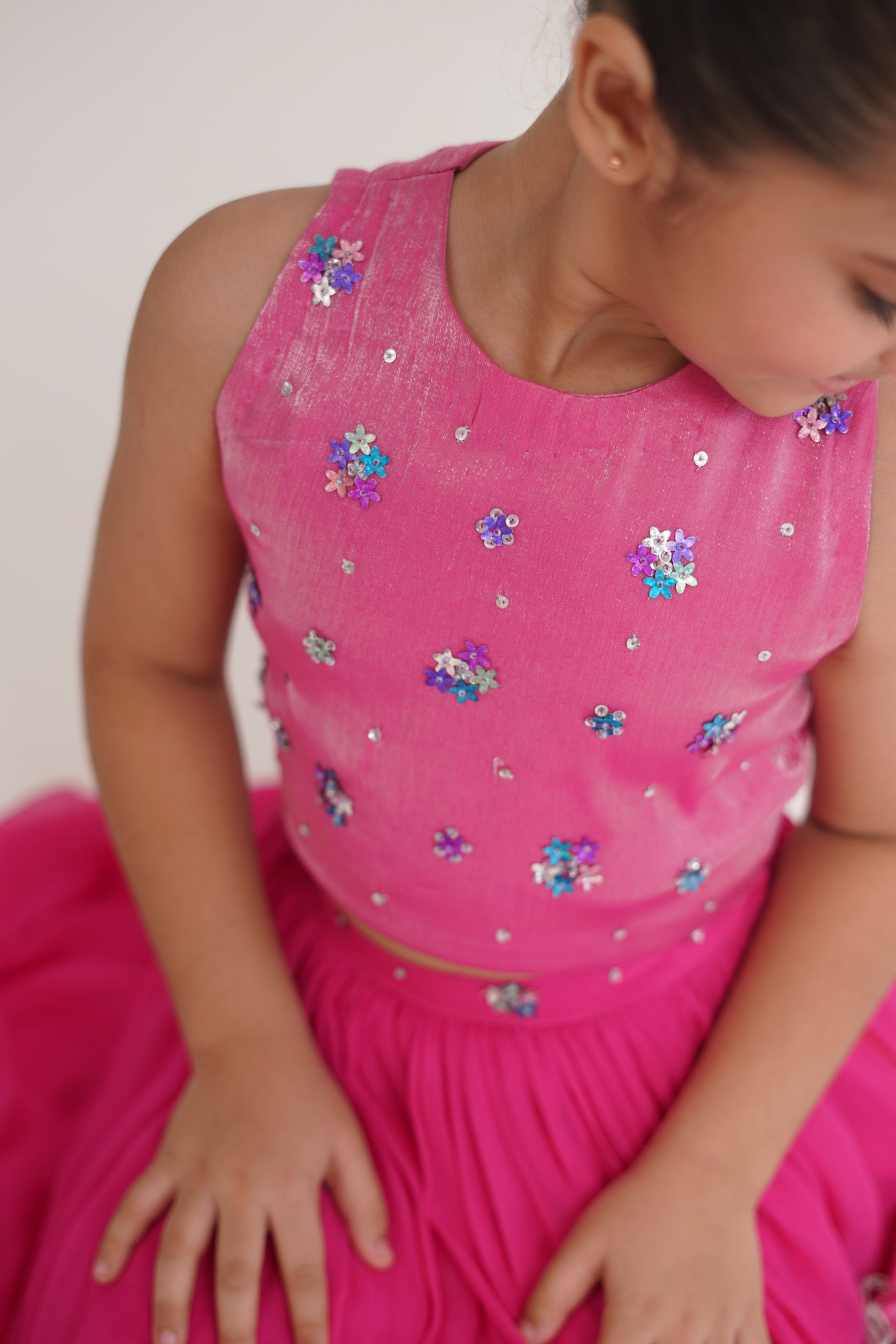 Introducing "Ayra" a hot pink lehenga choli covered in multicolored hand embroidered stars. The halter neckline, silk lehenga and "chan" give "Ayra" the necessary oomph your Mini needs at mehendi or any other late-night wedding events. Paired with a matching silver handmade potli and dupatta, this outfit is a must have in your Mini's closet.