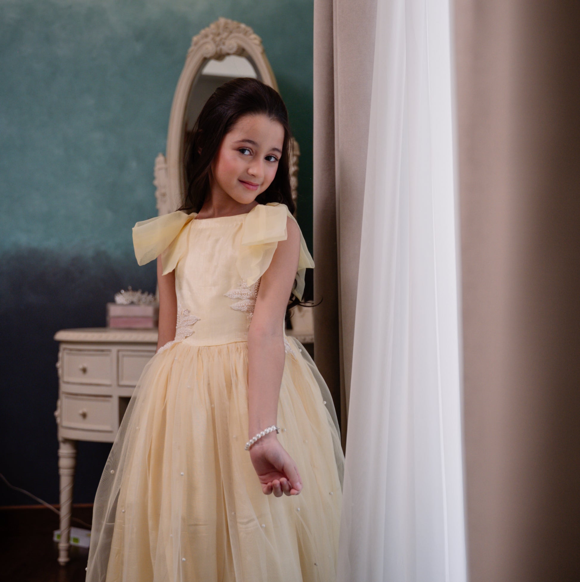 Introducing our charming “Belle” from our Ballroom of Dreams: a delightful butter yellow silk and net dress with pearl embellishments on the skirt, tie up organza sleeves and delicate pearl-work on the bodice. A dress surely fit for a royal princess to wear and pass on, because at Mini’s, it’s not just an outfit. It’s her first heirloom piece.