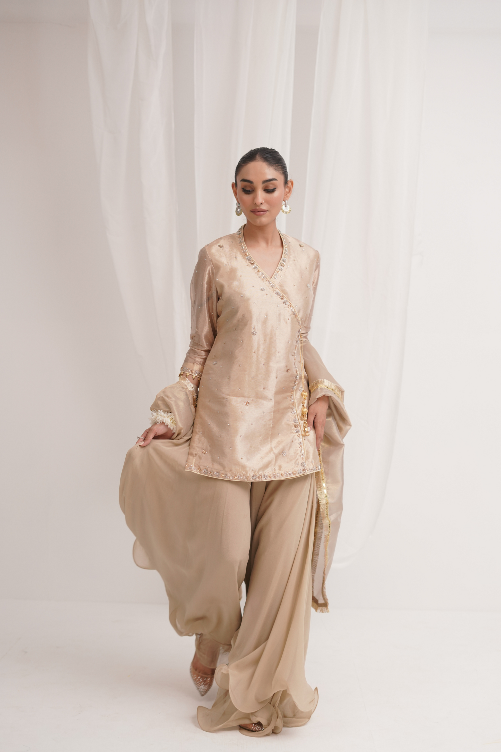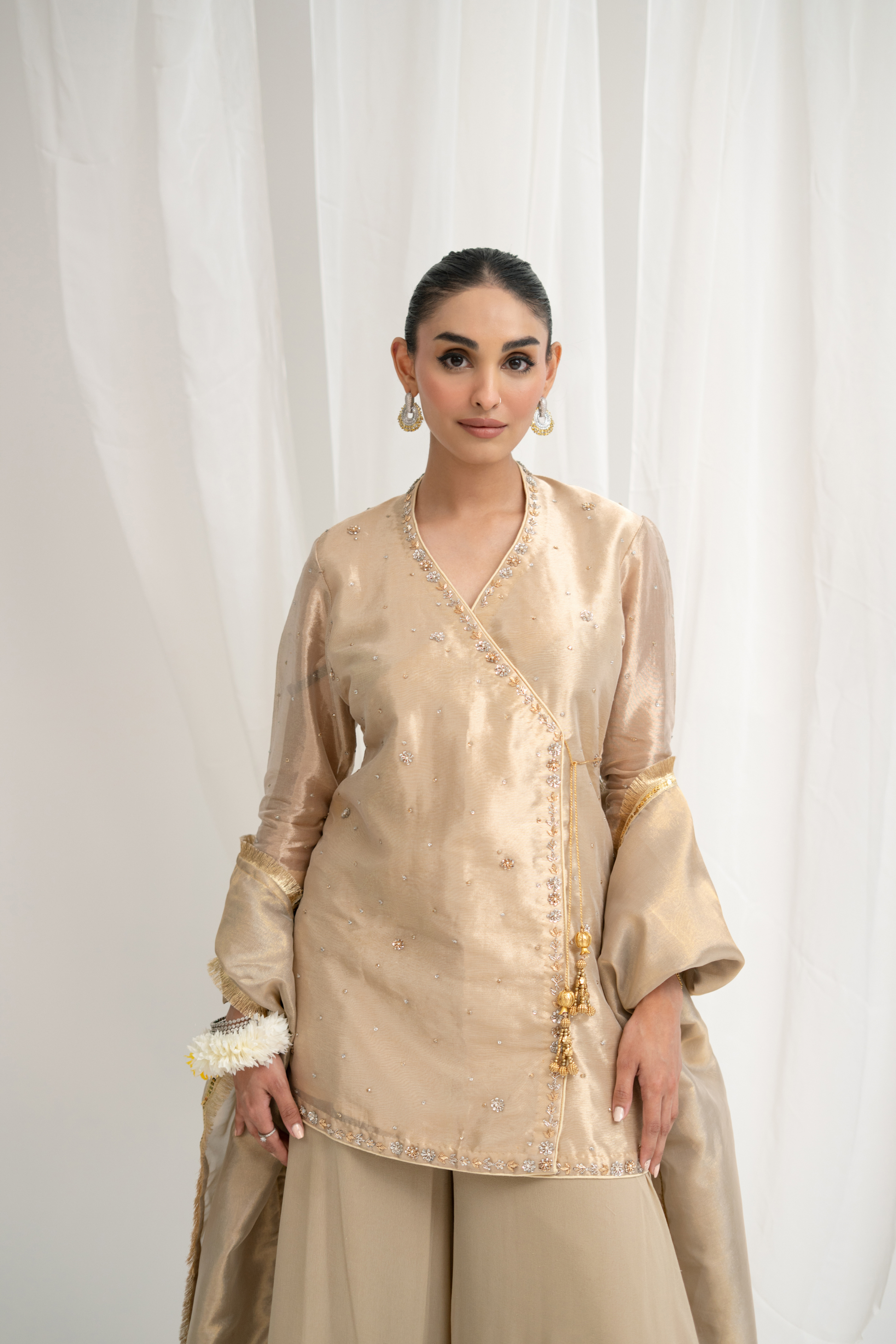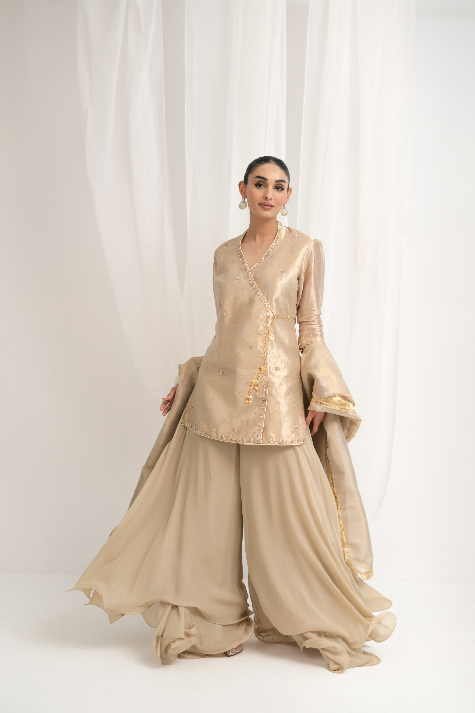 Introducing "Filza," a gold lama tissue angarkha and dhaka pants set. With hand embroidery all over, our hand made tassel adds the finishing touch to your favourite wedding wear.