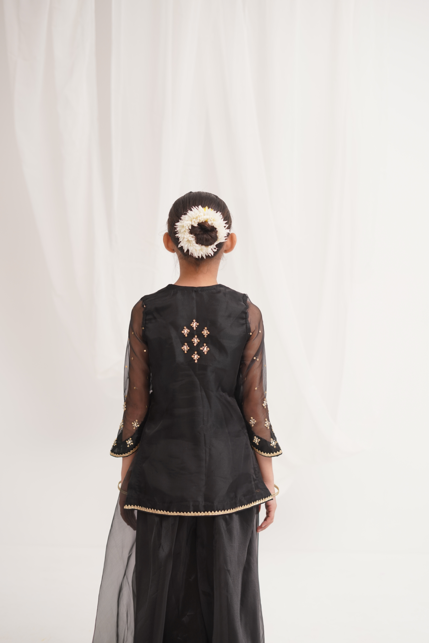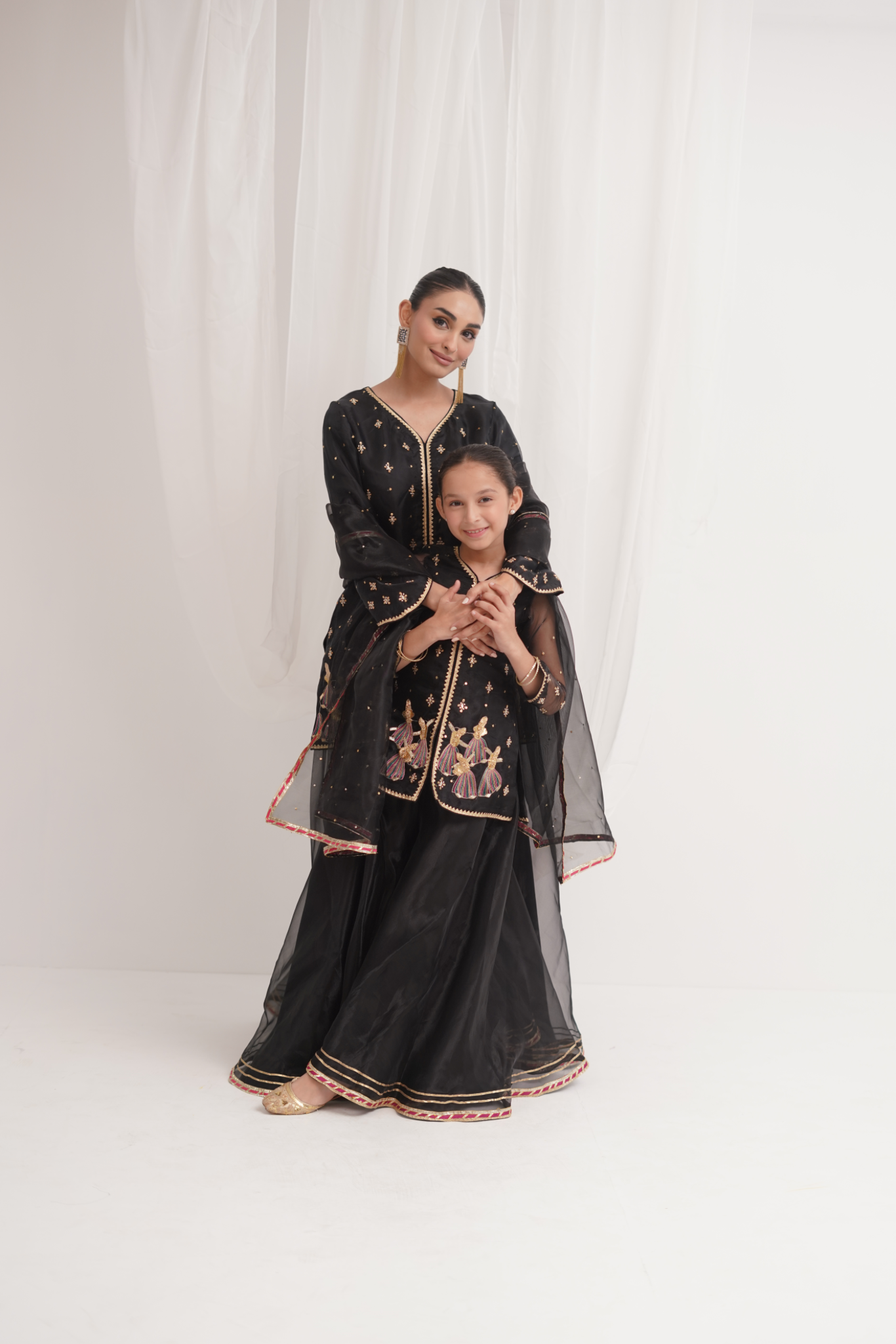 Introducing "Kulsoom," a timeless black short shirt and dhaka pants set. Its whimsical hand embroidered sufi details are bound to attract attention, be it at a dholki or baraat. Kulsoom's sequin "chan" and hand embroidered booties, added with the red chattapatti on the dhakas, create that festive oomph your Mini needs at events!
