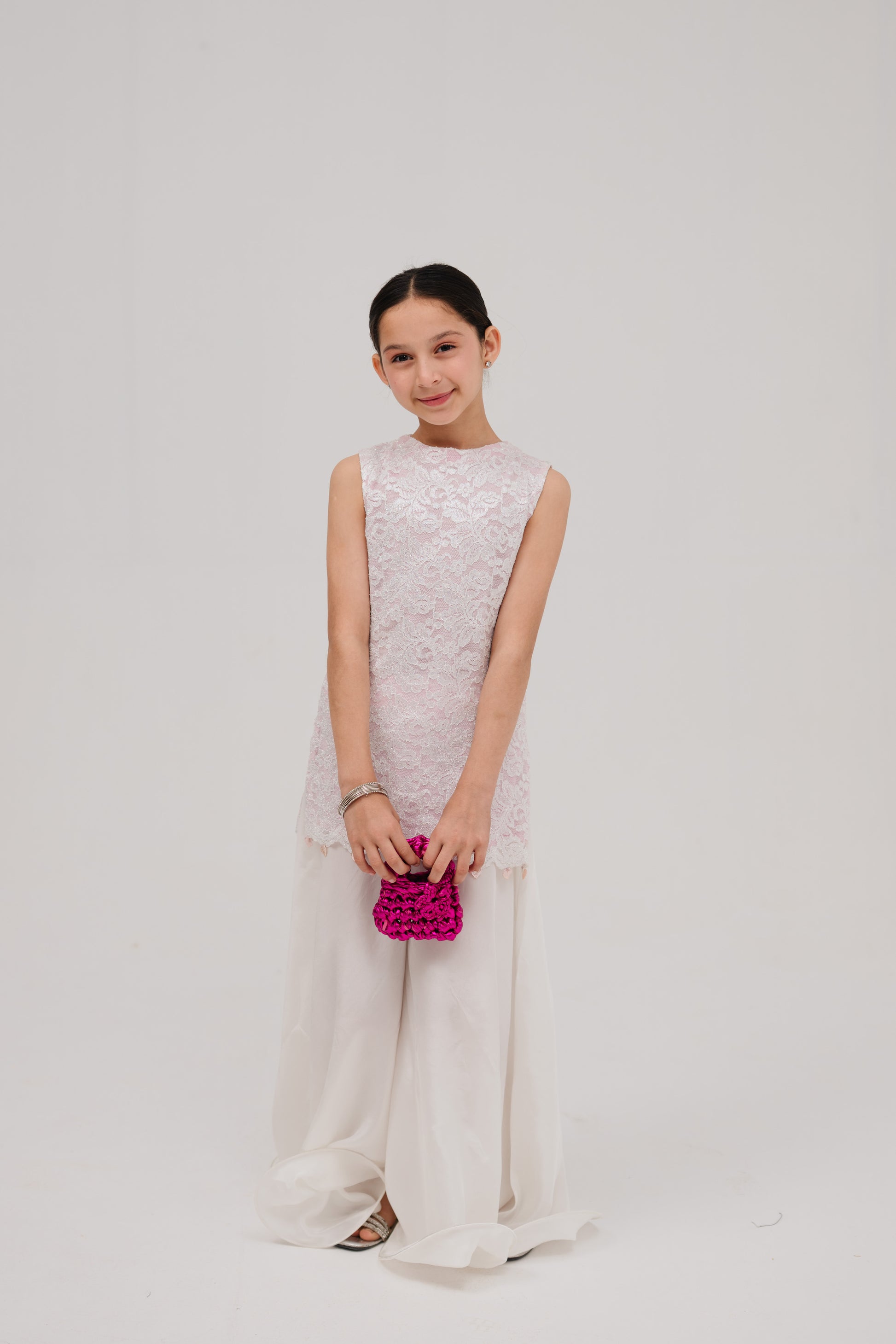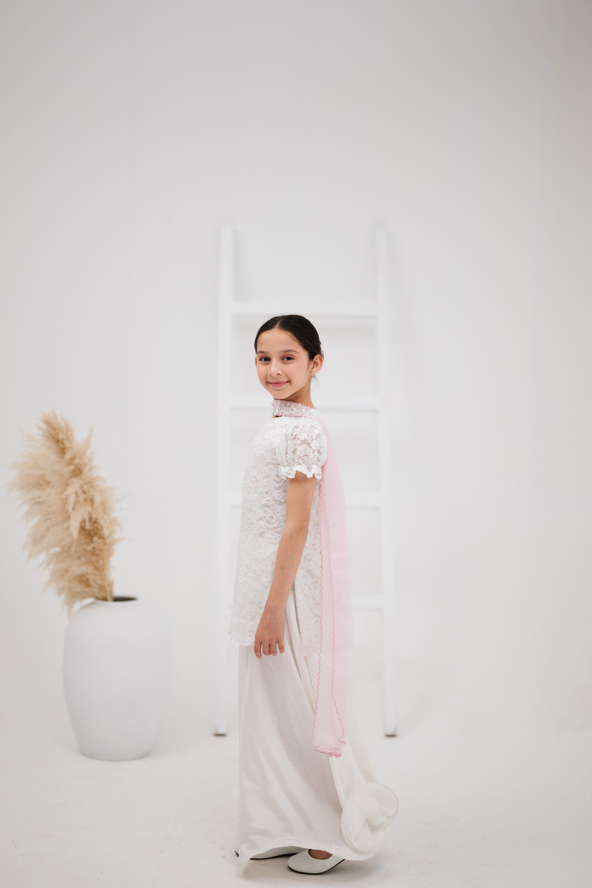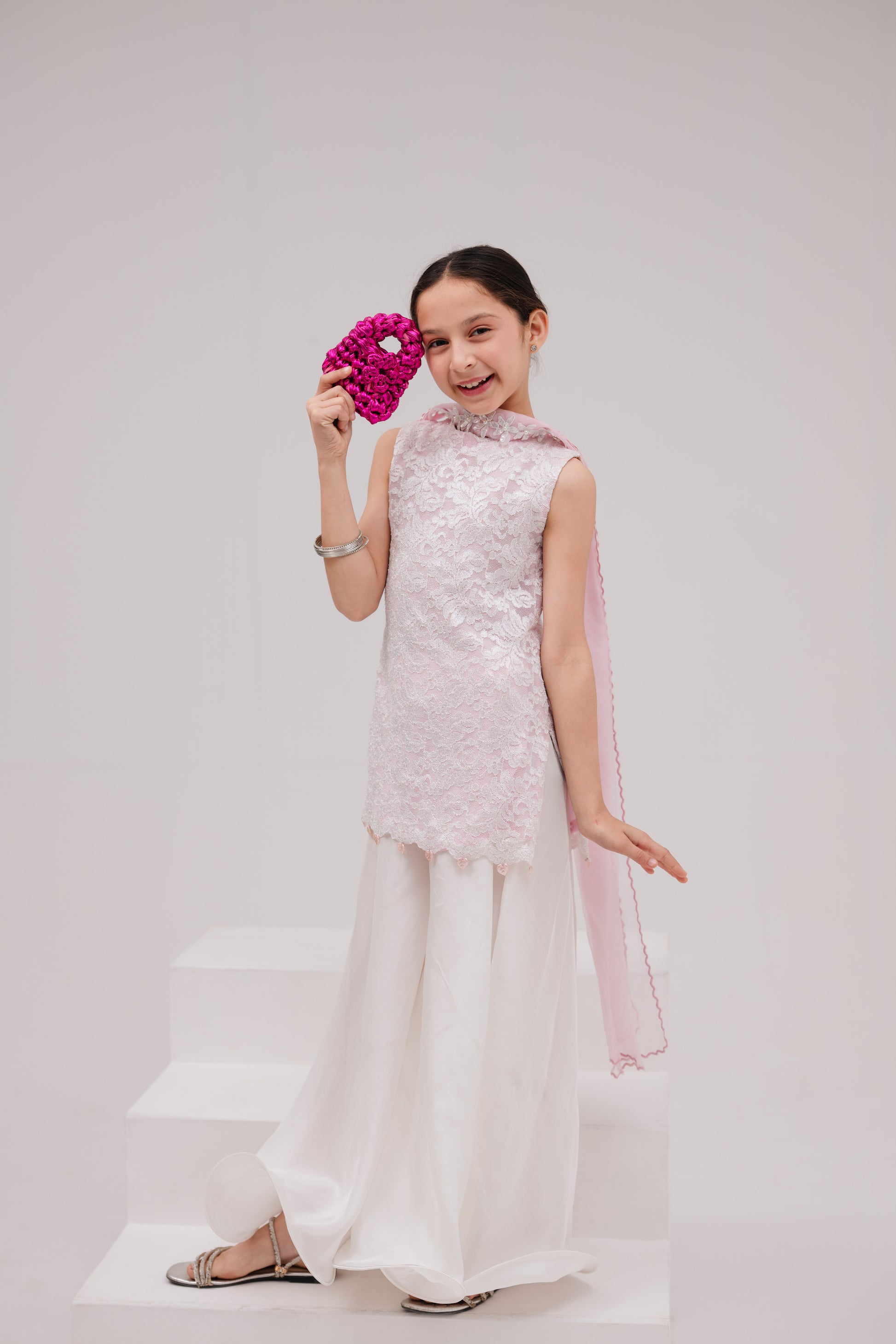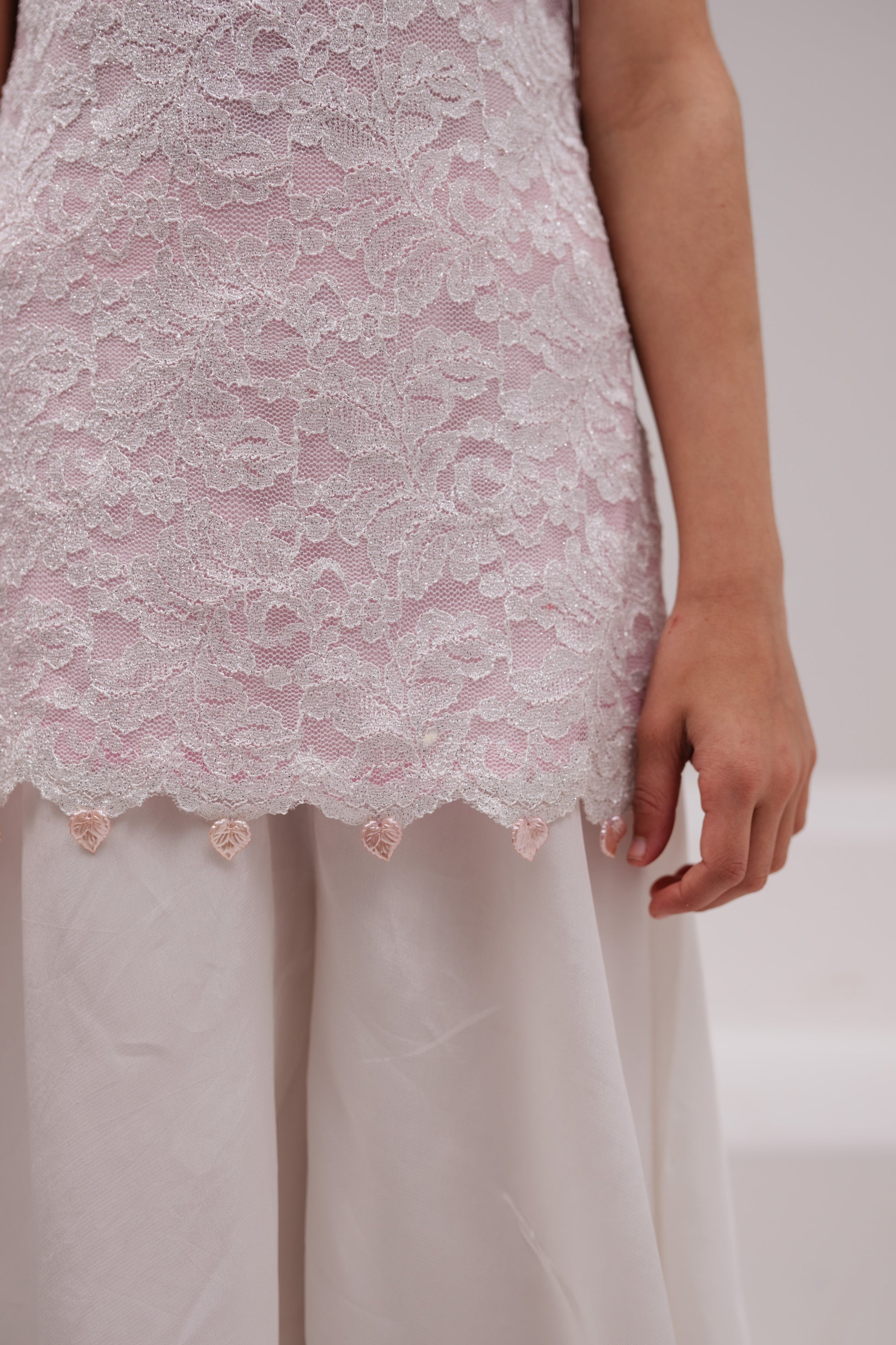 Lailee is a scalloped chantilly lace shirt, available with either pink or white lining, and paired with silk dhaka pants with fishwire and a gorgeous pink organza dupatta with flowers delicately stitched on the neck. Pink metallic leaves are hand strung onto the daaman for the most delicate final touch. Both versions of Lailee are available with different sleeve options. She is a perfect addition to every princess's Eid events.