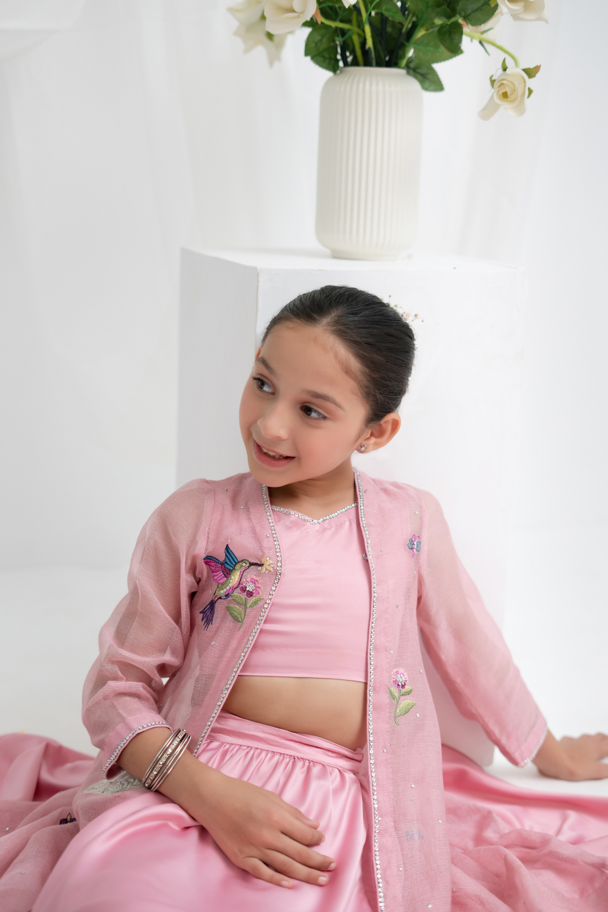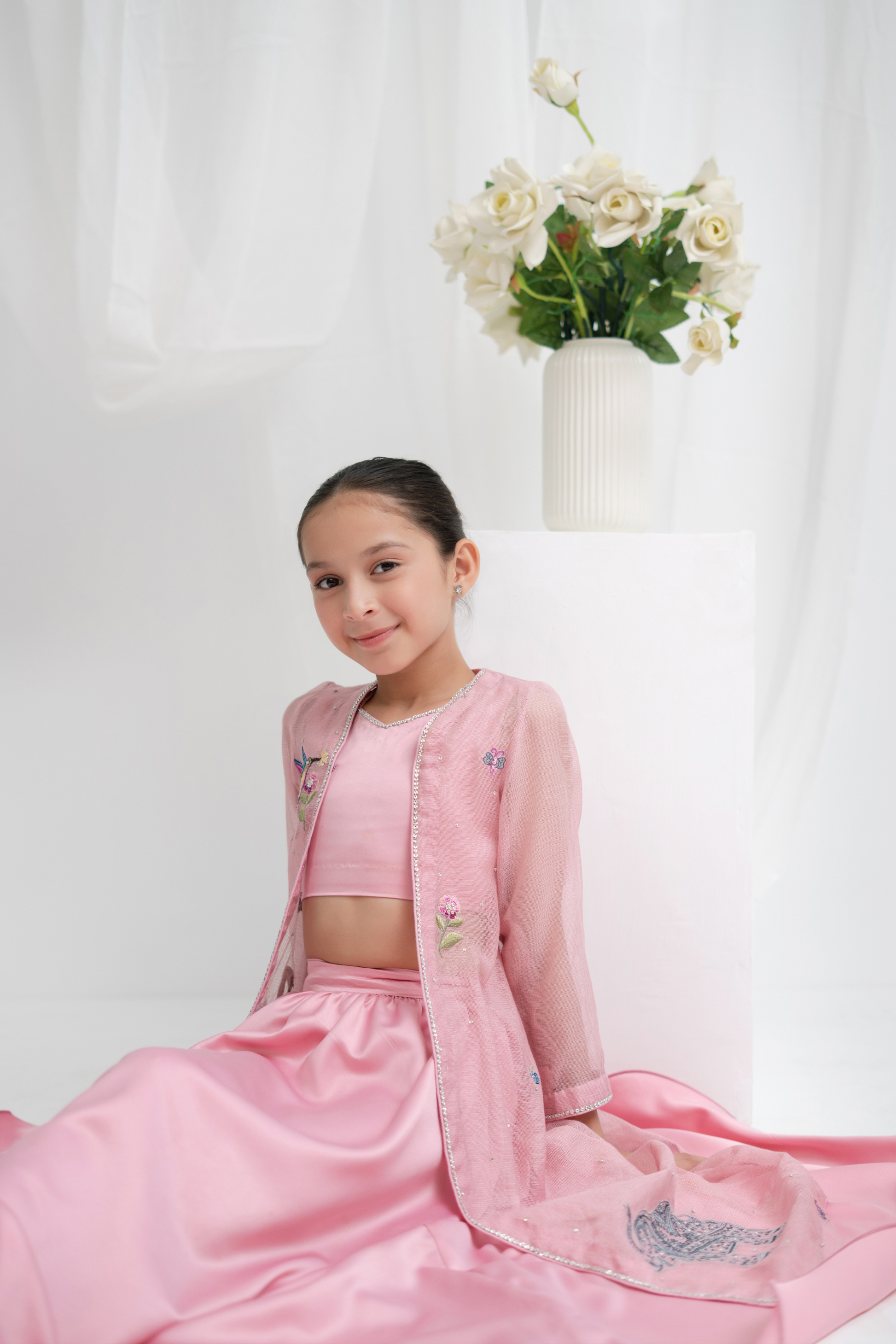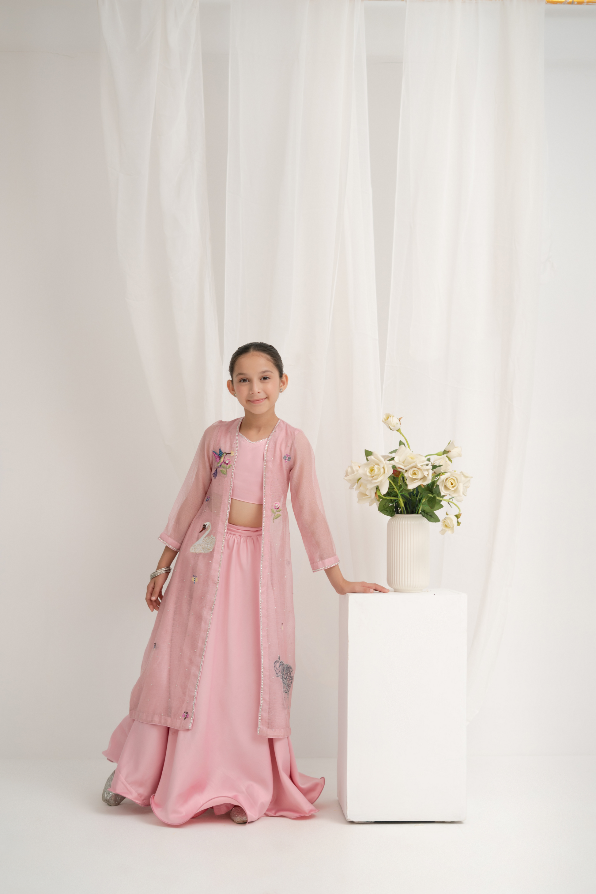 Introducing "Leena" a powder pink cotton net jacket embroidered with a delicate swan, bird, elephant, and many butterflies. The handworked sequins all over the jacket make it an even more exquisite piece for your Mini's wardrobe. Paired with a matching handworked silk choli and lehenga, this outfit is bound to serve looks to remember!