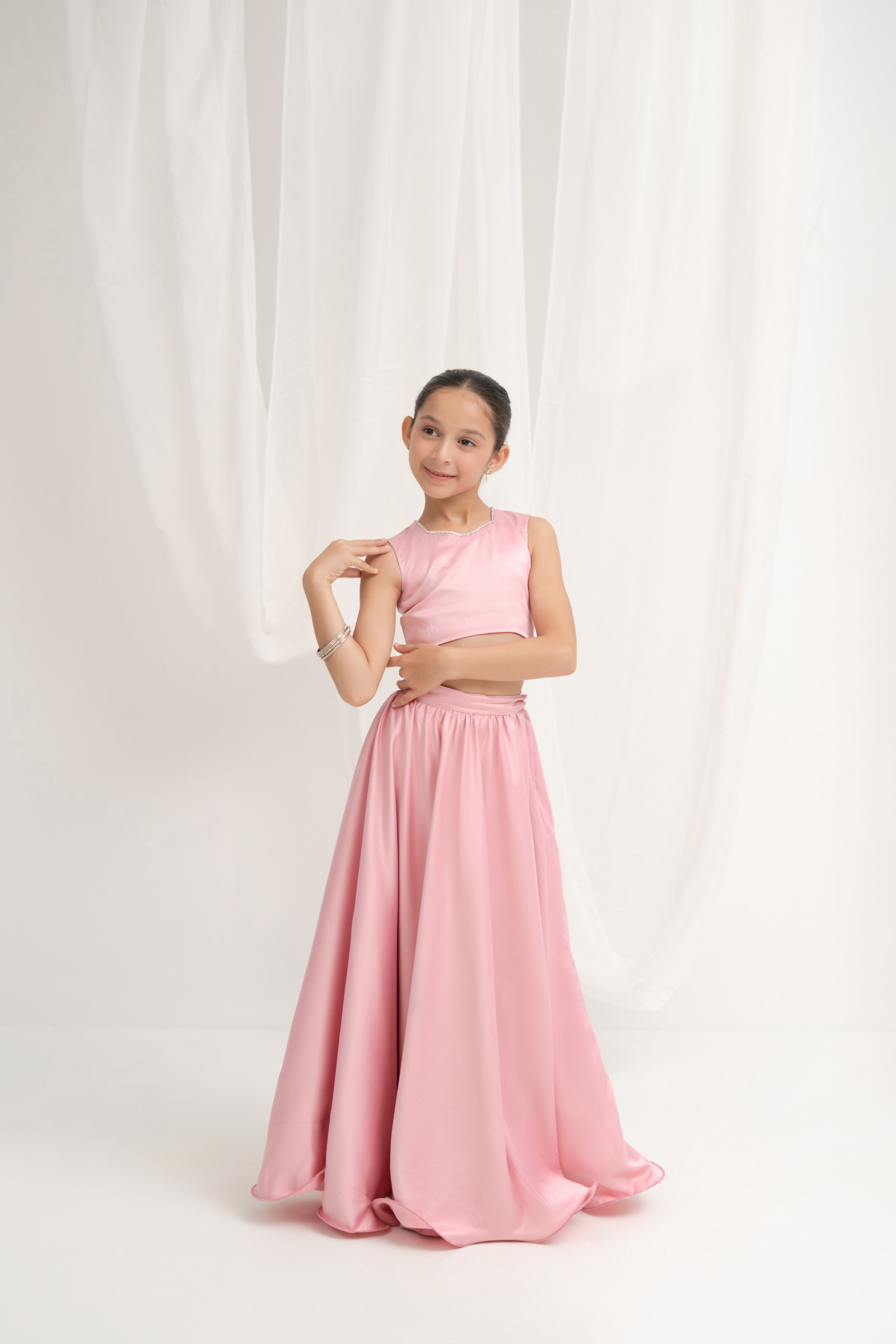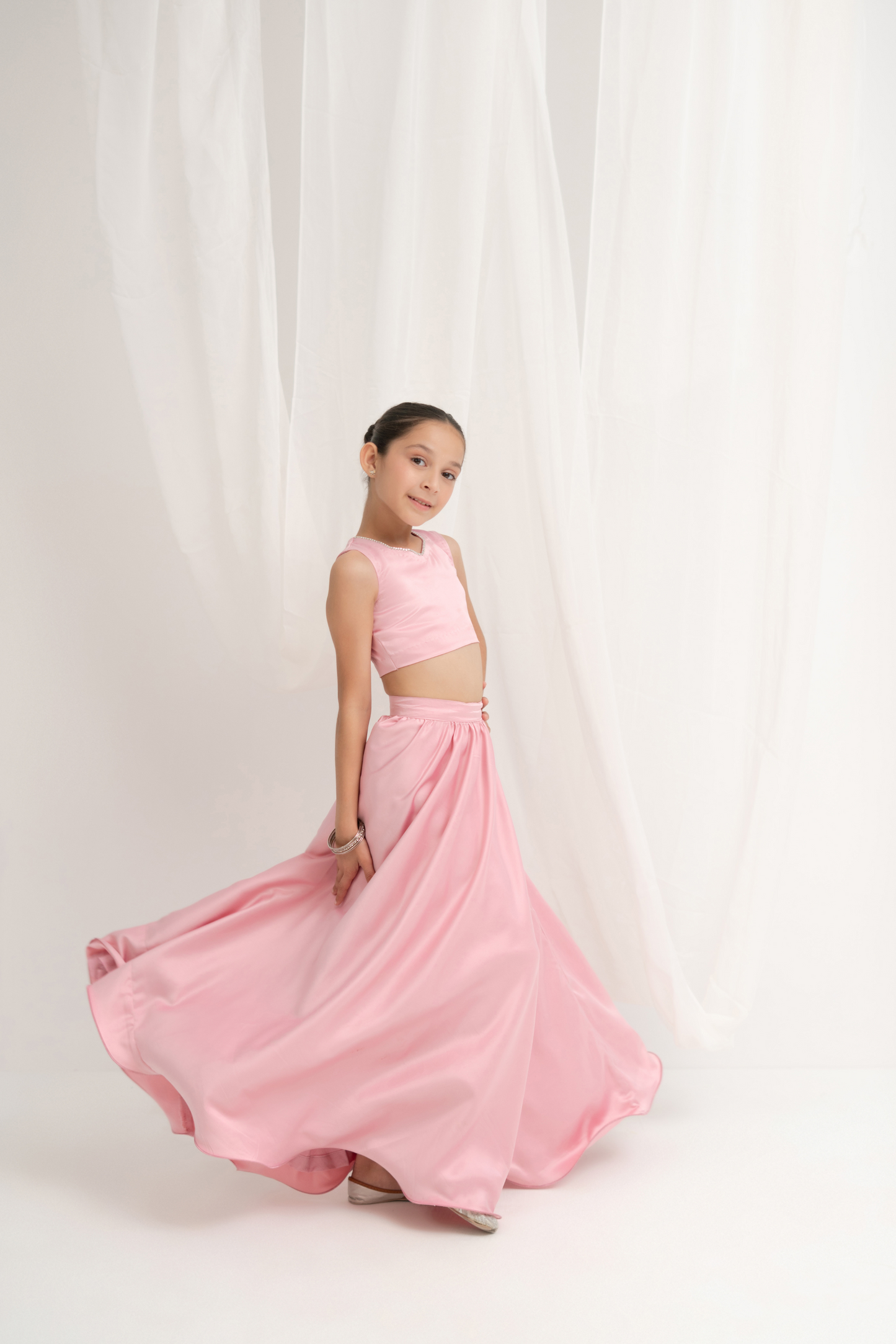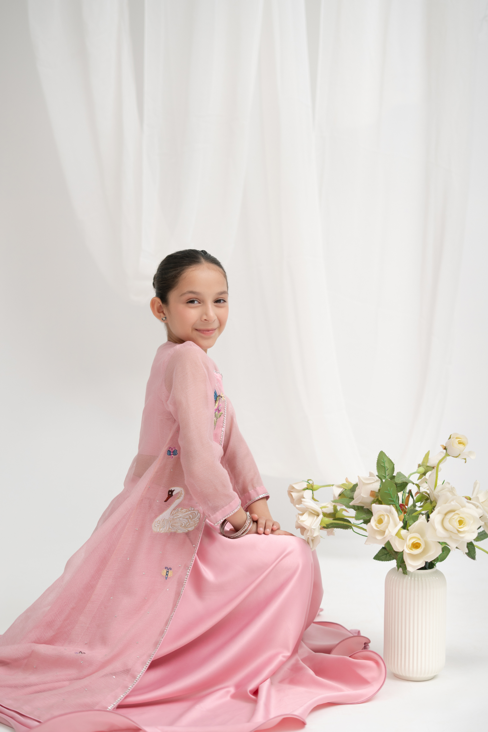 Introducing "Leena" a powder pink cotton net jacket embroidered with a delicate swan, bird, elephant, and many butterflies. The handworked sequins all over the jacket make it an even more exquisite piece for your Mini's wardrobe. Paired with a matching handworked silk choli and lehenga, this outfit is bound to serve looks to remember!