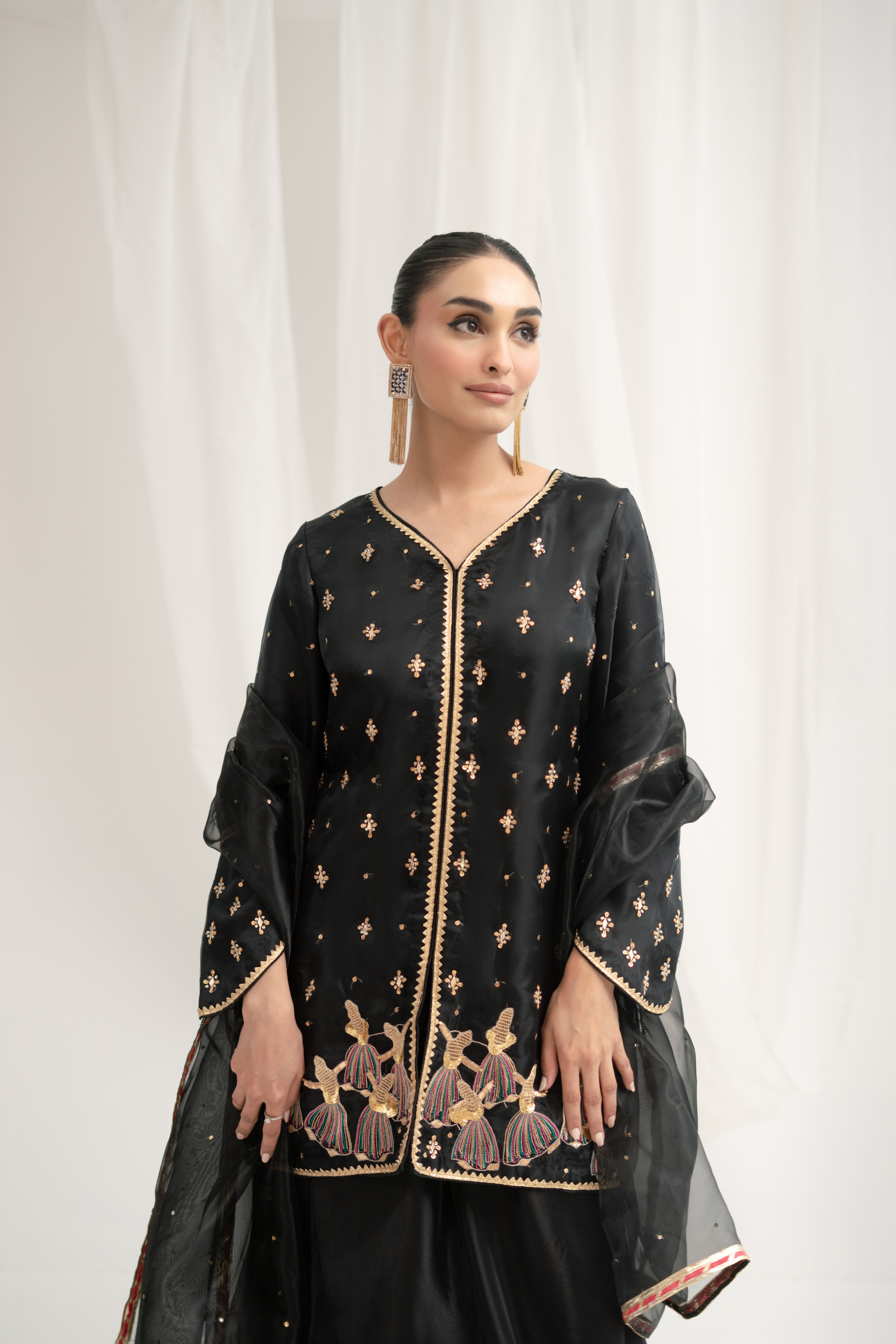 Introducing "Mehwish," a timeless black short shirt and dhaka pants set. Its whimsical hand embroidered sufi details are bound to attract attention, be it at a dholki or baraat. Mehwish's sequin "chan" and hand embroidered booties, added with the red chattapatti on the dhaka and dupatta, create that festive oomph you need at events!