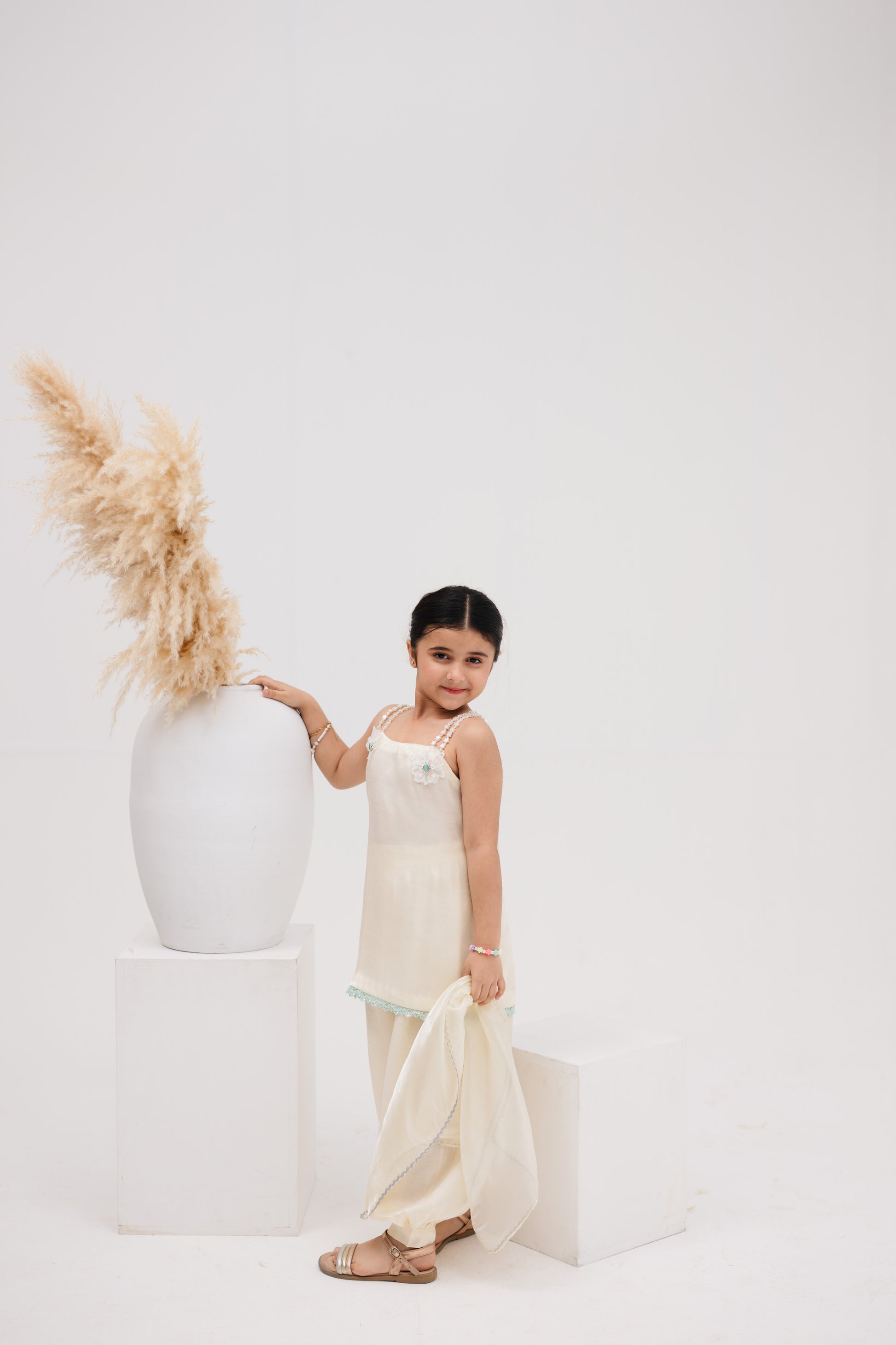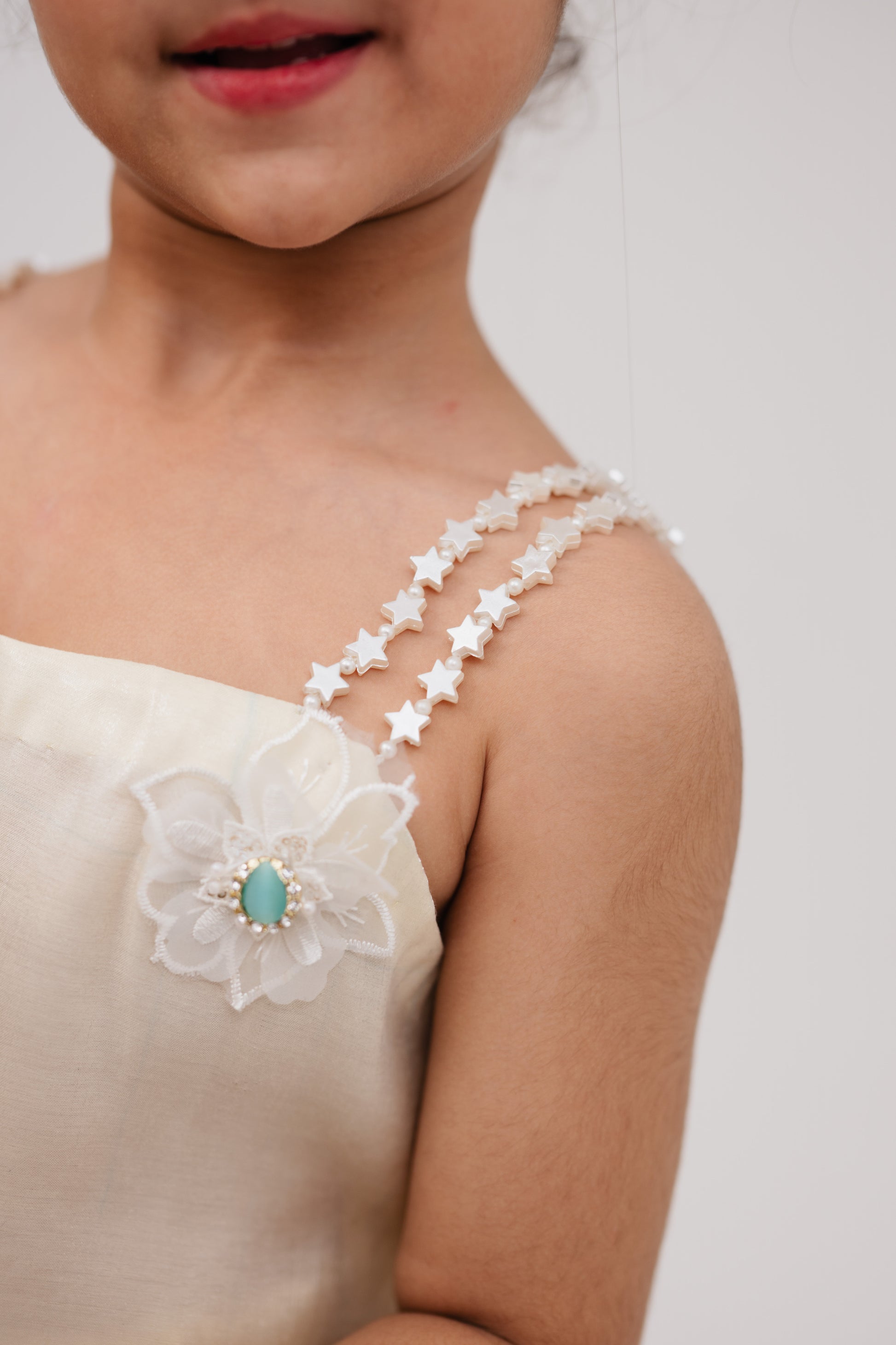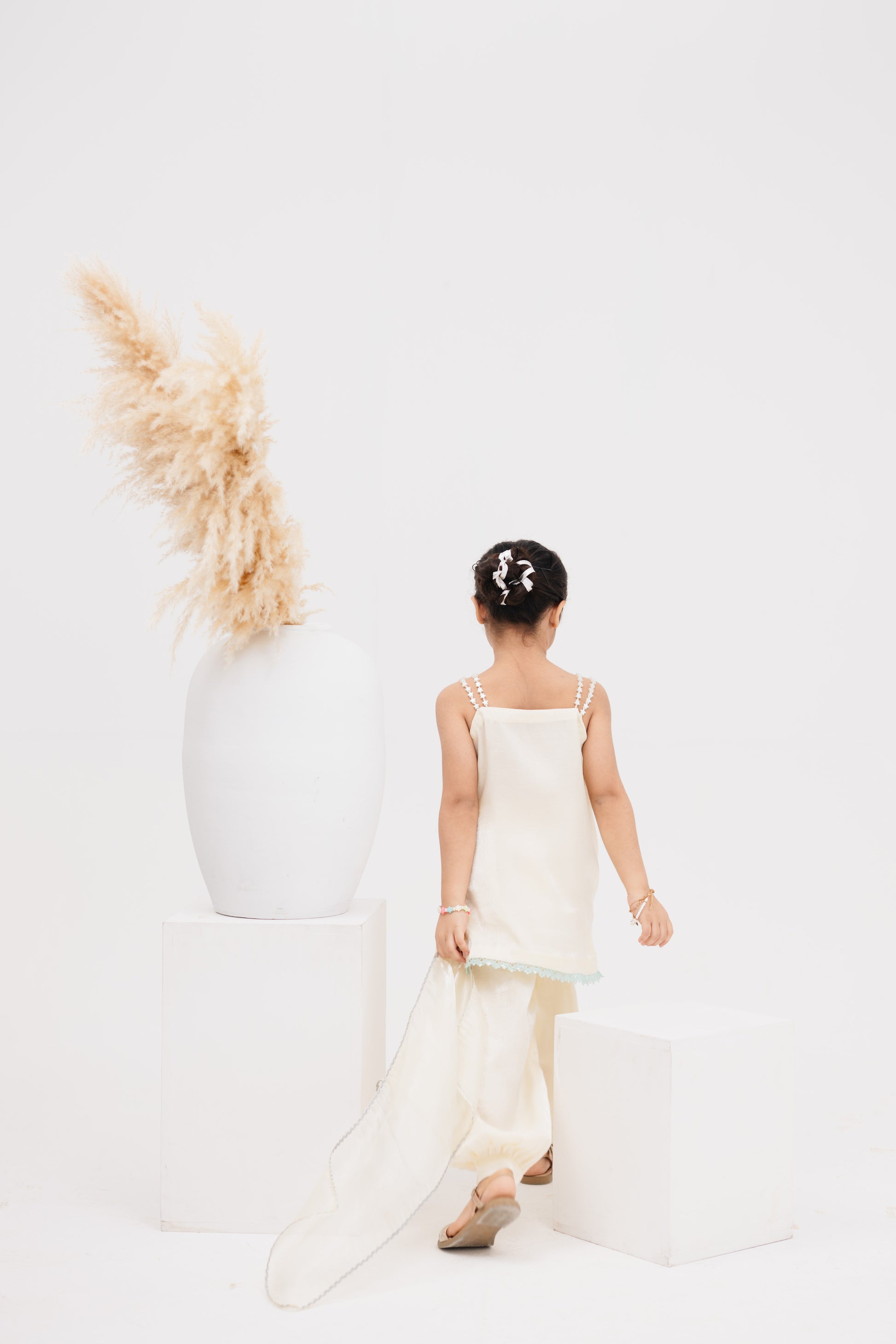 A butter yellow and ferozi lava silk outfit, Mira has stones and lace spread out on the neckline along with spaghetti sleeves with stars hand strung on them. Matched with balloon pants and an organza dupatta, Mira is both childlike and dainty, meant to be worn on Eid and beyond.