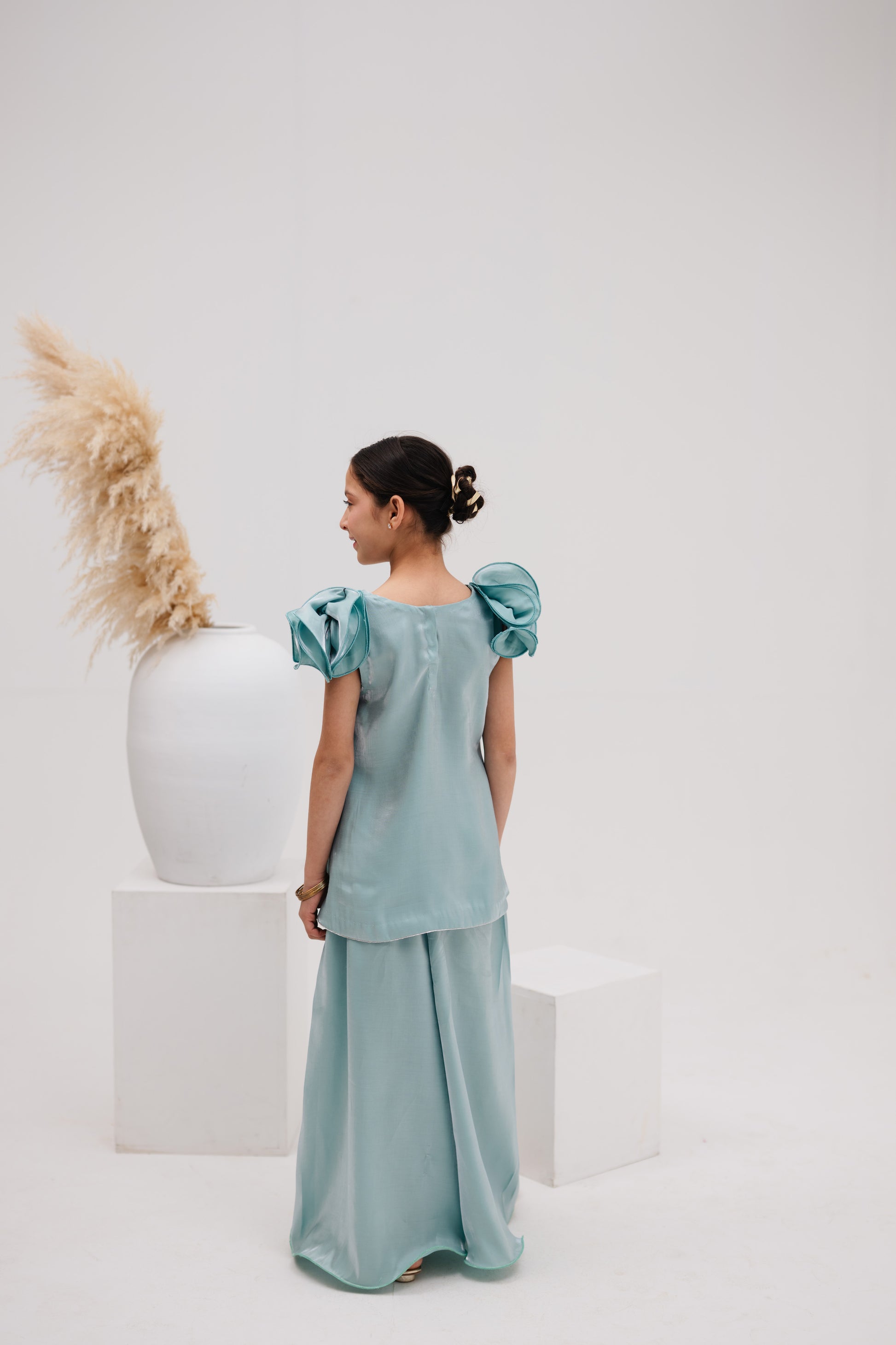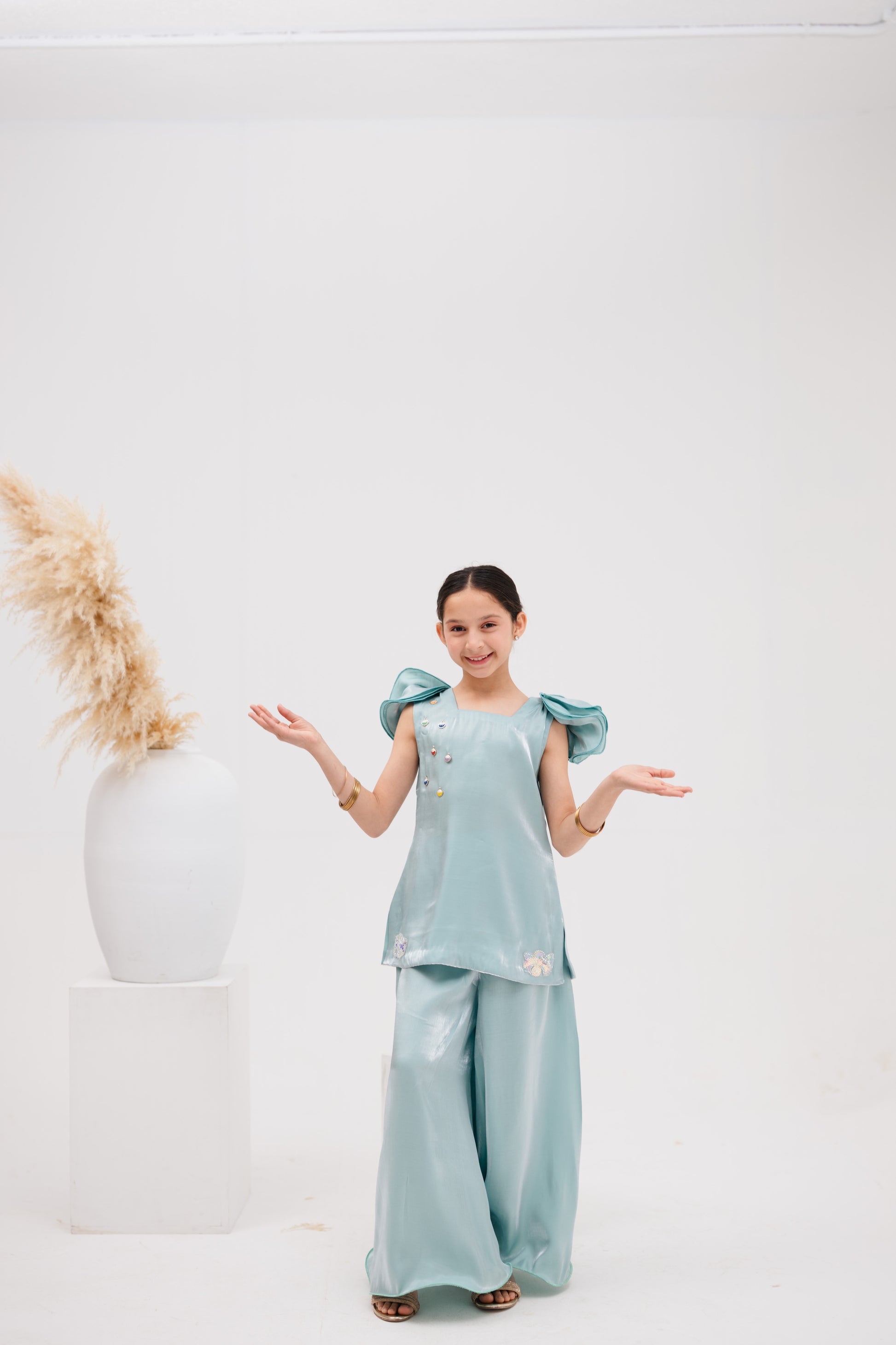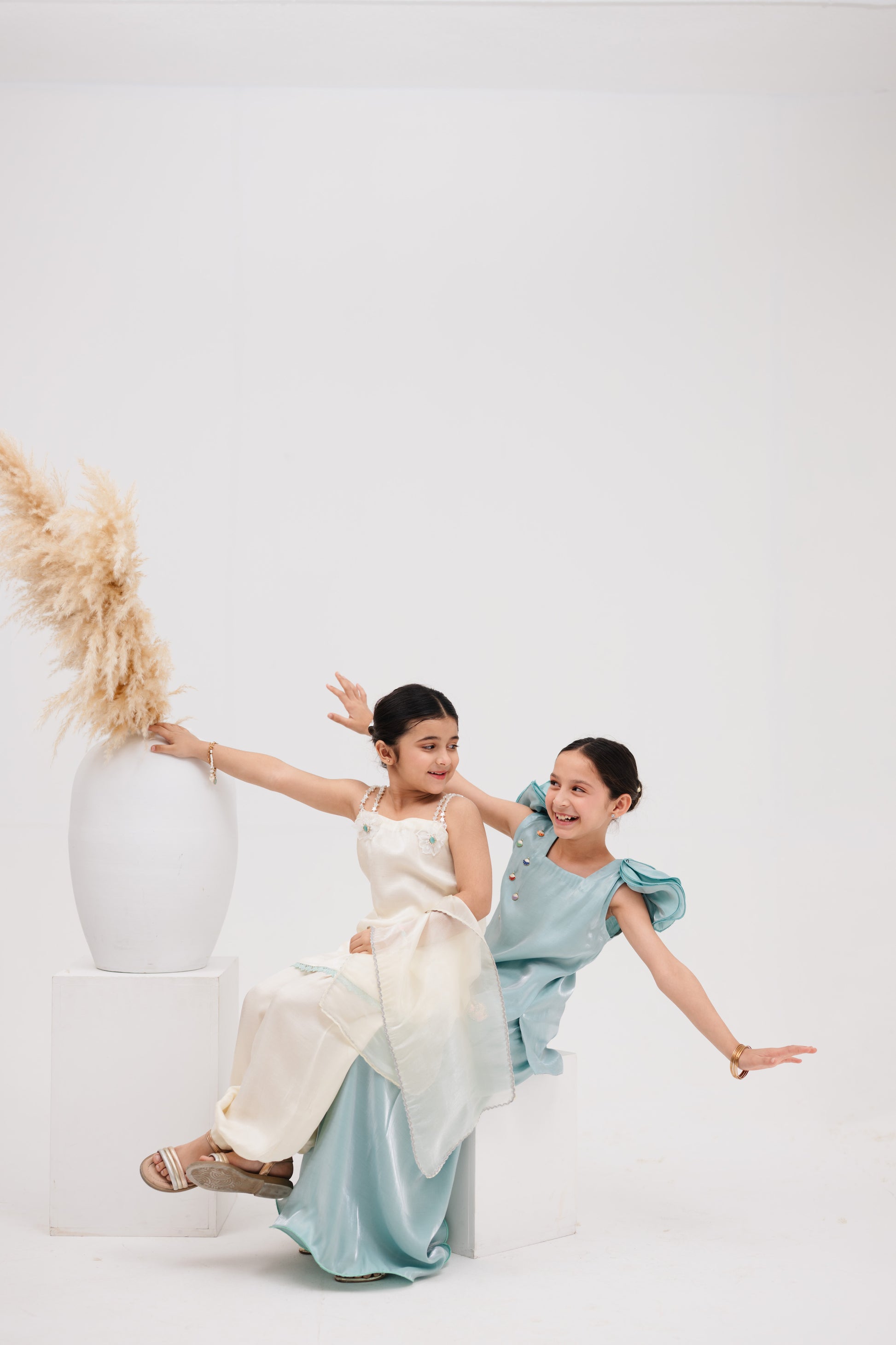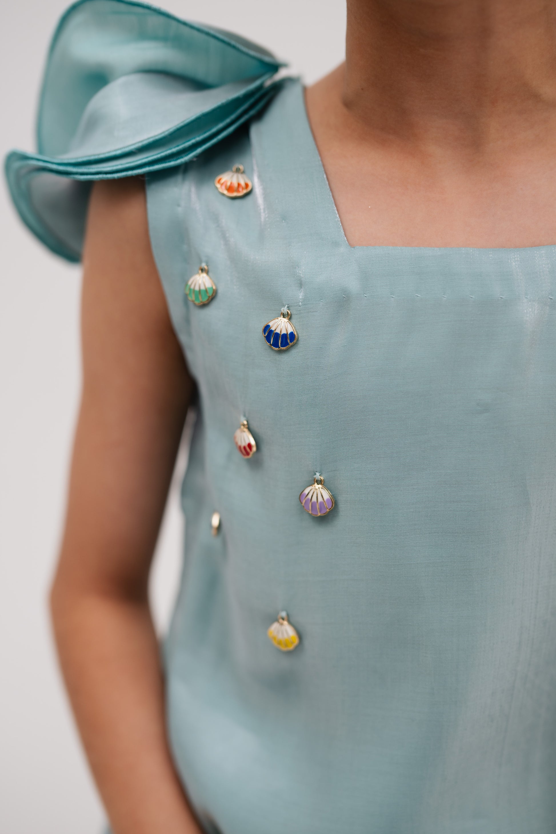Seashell is a whimsical and exclusive selection in lava silk. With our signature flower sleeves, a square neckline, metallic sequins on the daaman and hand strung metallic seashells in various colours, seashell gives off mermaid vibes. Paired with dhaka pants with fishwire, she belongs in your diva's closet.